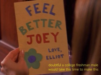 Well it looks like Dawson’s staying in Boston instead of going back to school in LA, mostly because of Joey. This is no bueno. Unrelatedly, was the general consensus on the last two seasons that it was cursed because now that they’re not in high school, it jumped the shark? Because I get that.