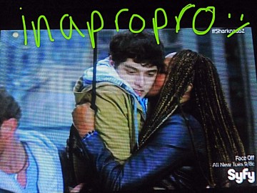 T: April and Fin are on this plane together (going through aforementioned storm) and when she goes to grab his hand, a huge giant sparkler is on her left ring finger – have these exes reconciled? Has the Sharknado actually done some good?
