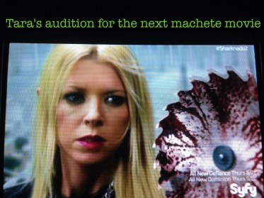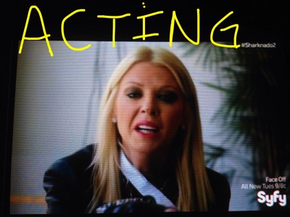 Mark McGrath and Fin have resorted to pilfering from bodegas and stealing a sword from an armored knight that just happened to be on display nearby. If you’re wondering where April is, she and her one hand are attempting to sneak out of the hospital. As she’s leaving, she hears some girl crying in the corner who’s super scared and just wants her mom. Naturally, April decides to take care of her and says “Take my hand and we’ll be okay” LOLOLOLOL. It’s like when Billy Zane stole that crying child and pretended to be her dad just to get on a lifeboat in Titanic. April gives the girl off to Downtown Julie Brown because the water and sharks are coming down the stairs, and her acting is still bad. Even the meteorologist on TV (who’s pointing at a graphic of a sharknado) is a better actress than Tara Reid.