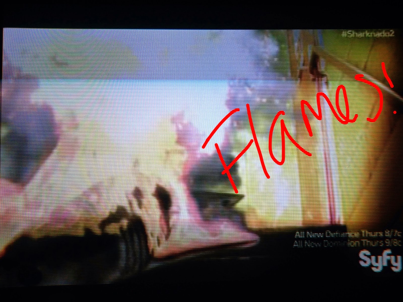 Just like in the first movie, Fin is throwing bombs into the sharknados to defuse them, but it’s not working so they double it up. And you know, Viv casually slices a shark coming at them with that sword from the knight in shining armor. Their bombs are still not working, and in fact, it’s resulting in fiery sharks landing on people on the street.
