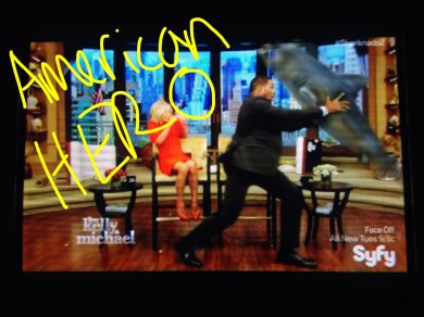 Fin finds himself flying through the air still – with chainsaw in hand – and literally goes through a shark and goes out the other side screaming and (finally) covered in blood. We go back to Kelly & Michael for some reason and they’re still doing their show. Producer Gelman tells everyone to stay calm but he gets eaten by a shark that comes out of nowhere (LOL TO THE MAX) and Michael legit stops one from killing Kelly with his bare hands, and she steps on one with her red high heels. I love those two.