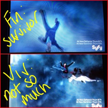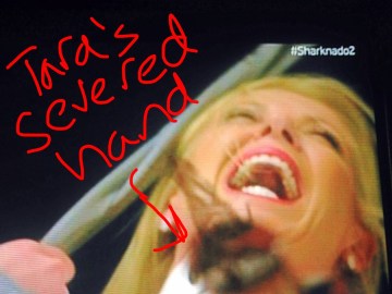 Viv is risking her life to connect the cables to create lightening or whatever, and they’re successful, except both she and Fin are thrown into the Sharknado and while he’s easily floating by all the sharks, she gets cut into two. Huh?
