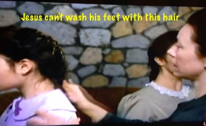 T: WJ’s first wife is inspecting some girls who are getting prepared to be set up with their future husbands. In this process of making sure their horrendous dresses are perfect and not a hair on their head is out of place, she comments to one, “Your braid isn’t tight enough” I mean also your braid isn’t in fashion, but apparently there’s a reason. That reason is for Jesus.