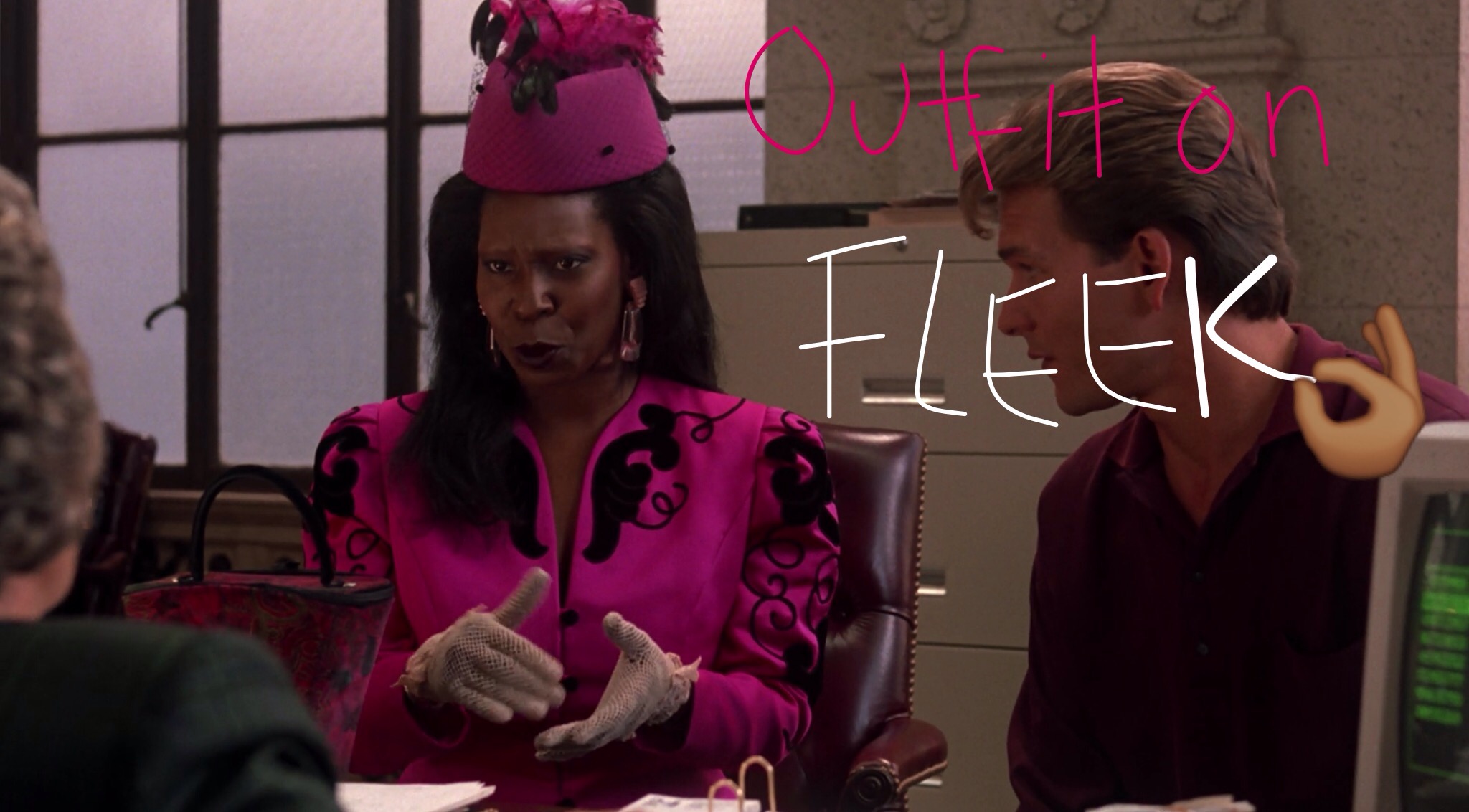 1:20 All the ‘spooks’ are in Oda Mae’s office because they somehow heard she can actually channel the dead. Some ghost named Orlando takes over Oda Mae’s body and Whoopi is killing it as this 50ish year old black guy. It’s legit as if this dude took over her body, it’s fantastic.