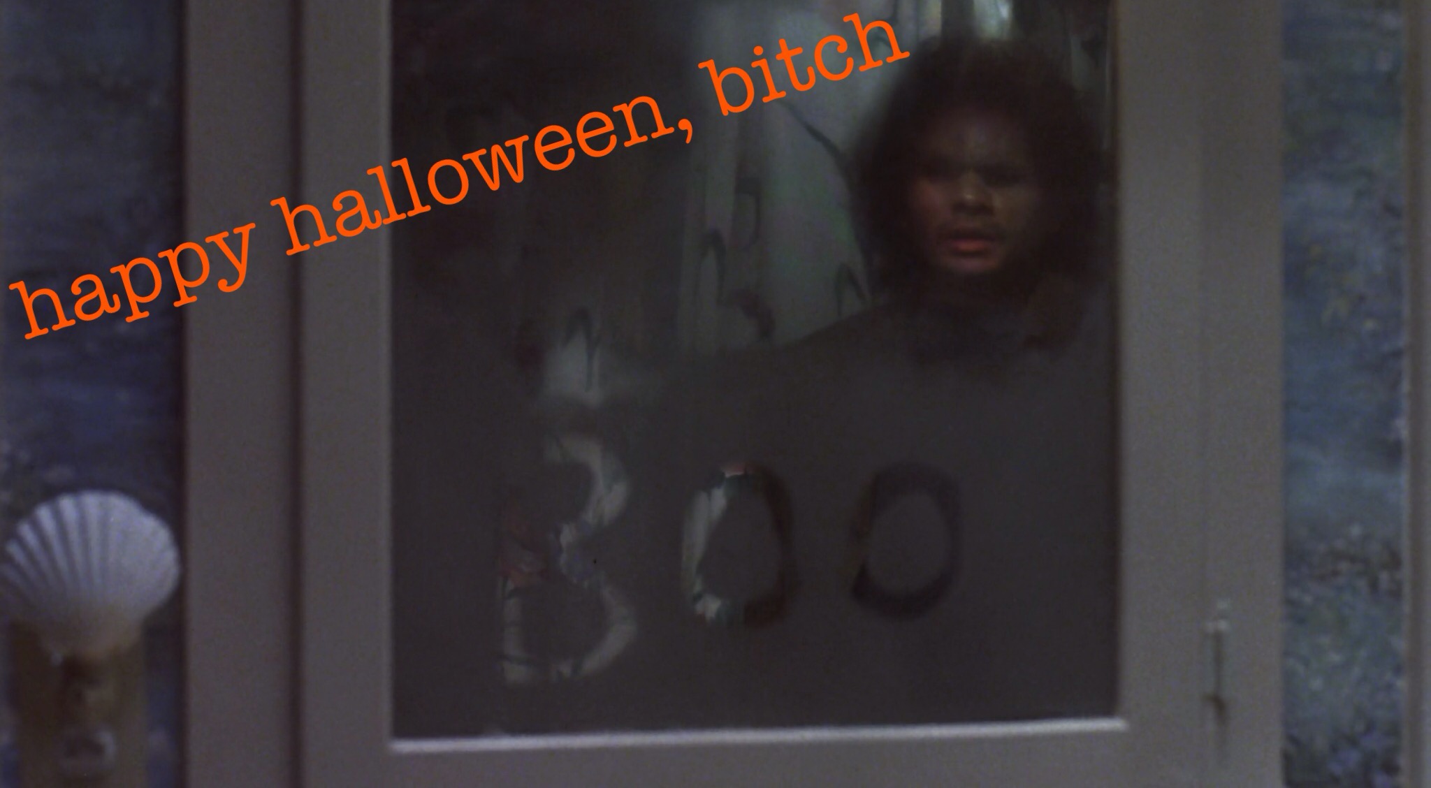 1:41 Willie and Carl come looking for Oda Mae but she manages to escape. Willie on the other hand can’t escape Ghost Sam. He makes the books and art on the wallpapered walls come down towards Willie and they end up in the bathroom, where GS leaves Willie a sweet message: