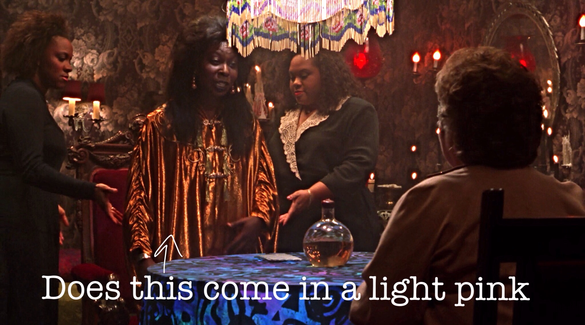 This entire scene looks like a set up to steal customer Mrs. Santiago’s money. I mean look at Oda Mae’s outfit