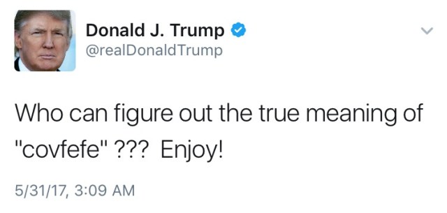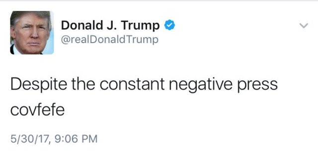 Last night, or rather around midnight Washington, D.C., time, Donald “I have the best words” Trump tweeted “Despite the constant negative press covfefe”. Assuming he meant to type “press coverage”, one would think autocorrect would’ve stopped him from sending out a typo. Or that he would notice immediately after sending it out that he spelled it wrong. Or that one of his staffers would notice it and tell him to take it down. Or that it’s not even a complete sentence. Any of the above. But nope. It stayed up for hours. To give him the benefit of the doubt, maybe he’s just really exhausted and stressed out and gaining weight and can’t think straight. But on the other hand, it could be the bots. Maybe HE is a bot.