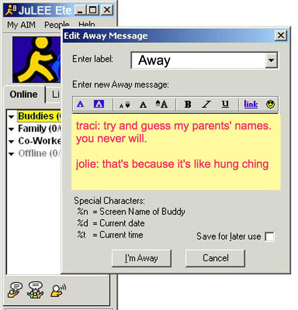 Like many millennials, I haven’t used AIM in years, but it was such an integral part to our lives when the internet was just becoming a thing in the late 90s/early 2000s. Before Snapchat, Instagram, GChat, Twitter, Facebook, and kinda before texting, there was AIM. It was social networking before we knew what social networking was. We’d spend all day at school with friends, only to go home and turn on AIM to talk to friends some more. We’d perfect our AIM profiles with the right quotes and shoutout to friends using their initials – it was a precursor to perfect a Facebook profile. It’s where we first learned how to abbrev – “brb”, “a/s/l?”, “nm, u?” etc. AIM let us make our first internet identities with vague SNs (screennames duh) that gave others a hint of our interests and/or hobbies (one of my first ones had “BSB” in it). We’d sneakily put our crush’s SNs on our buddy lists and get giddy when we heard the sound of the door opening and their name flash up on our ~*u kNo wHo*~ buddy list (1/1). If we were super bored, we’d open a new window for Smarter Child and see what they were up to. We’d put up elaborate away messages with way more info than we ever should’ve given out. Or if you’re like me, you’d just keep an away message on 24/7 even though you’re sitting in front of your computer and not, in fact, away.