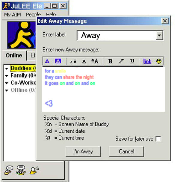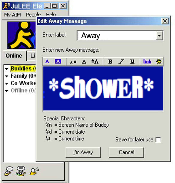I was such a sucker for these. It took creativity and skill to make an elaborate away message, even if it was just a few words (that could’ve been shortened to BRB).
