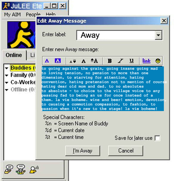 Because I’m a hoarder of sorts – I like memories, OK – I was one of those people who installed a secondary program which automatically logged conversations with my friends. My archive only goes back to like, 2004 right before I started college, but boy oh boy did I find some gems. Re-reading all these got me thinking – why? Just why? But also, making an away message was like a first generation Facebook status update (IE: “Traci is… really upset that her VCR decided not to tape the last 5 minutes of the American Idol finale.”) It told a story about your mood, what you were doing, where you were doing it, who you were do it with, who you were thinking about while doing the thing – it gave a lot of details away – information superhighway, amirite?? After going through my archives, I noticed a few trends that made AIM the iconic fly trapped in amber that it is. Here are some of my favorite/questionable away messages, not only of my own, but also of some of my friends. Don’t worry, your identities are protected. To reiterate, these are REAL.